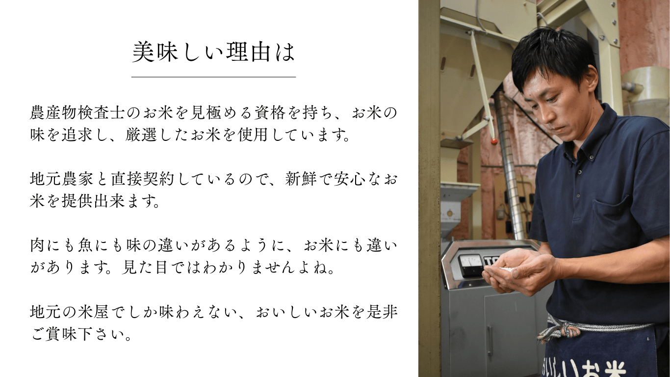 オリジナルブレンド米 【匠の味】 25kgお得パック 【送料無料】 袋代や箱代がかからない分お安くできるお得パック! 25キロ入りの紙袋の状態でお届け。 オリジナルブレンド米 【匠の味】 25kgお得パック 【送料無料】 販売価格: 19,000円(税込) 在庫あり 数量: 1 返品特約に関する重要事項 お問い合わせ 他の写真 お米は契約栽培をしており、信頼の出来る農家さんのお米を使用しています。 土質や栽培管理でお米の味が変わります。食味を向上する為にバランスの良い施肥設計、有機物を入れ豊かな土壌にしてこそ、甘く粘りのあるおいしいお米が出来ます。是非一度ご賞味下さい。 お米は鮮度が命。産地直送ならではの精米したてのお米をお届け致します!